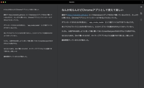 趣味で https://github.com/gaaamii/nekobito というMarkdownエディタをElmで書いているんだけど、久しぶりに開いたら、Chromeアプリとしてインストールできるようになっていた。 ダウンロードされたものを見ると、 app_mode_loader という謎ファイルができ…