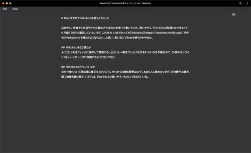 以前から、仕事やら生活やらで必要なメモはBearを使って書いていた。使いやすく、Pro(iCloud同期とかできる)でも月額150円と安く、満足していた。けど、これだといつまでたってもNekobito(手作りのMarkdownメモ帳)がよくならない...と思い、思い切ってBe…